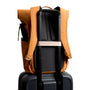 The adjustable capacity and familiar shape of a rolltop commuter backpack, enhanced with modern organization and access.