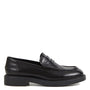 Alex W is the everyday penny loafers crafted in black polished leather featuring moc-toe details, almond-shaped toes and a traditional penny slot across the vamp. The style sets on solid rubber outsoles with a low heel measuring 33mm. Details include visible stitching along the outsoles.
